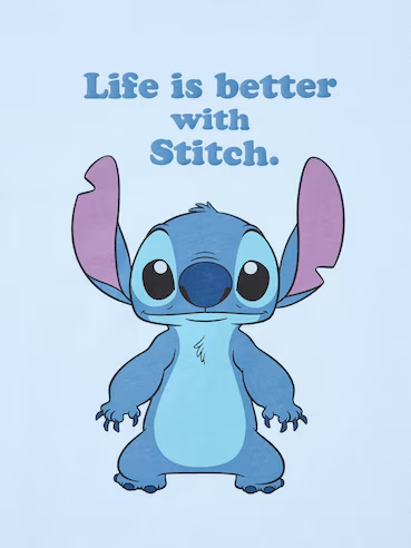ดีไซน์ ลายตัวละคร Stitch จาก Disney พร้อมข้อความภาษาอังกฤษด้านบนว่า “Life is better with Stitch.”