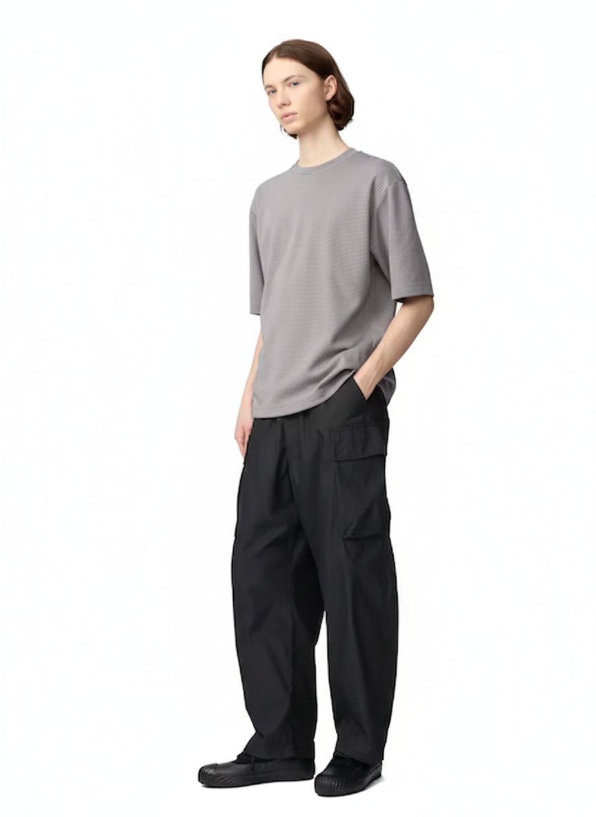 ทรงไหล่ตก (Dropped Shoulder) และแขนเสื้อยาวระดับข้อศอก ให้ความรู้สึกผ่อนคลายในสไตล์ Urban Street